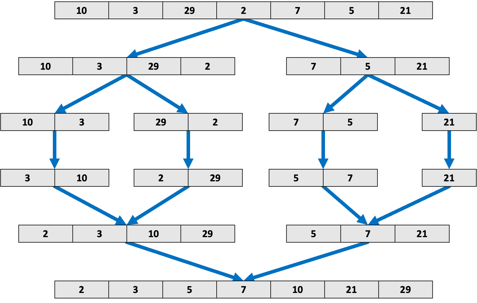 Merge sort(병합정렬)은 행렬을 2^n개로 나누어 정렬하고 병합해 가면서 정렬하는 방식이다.