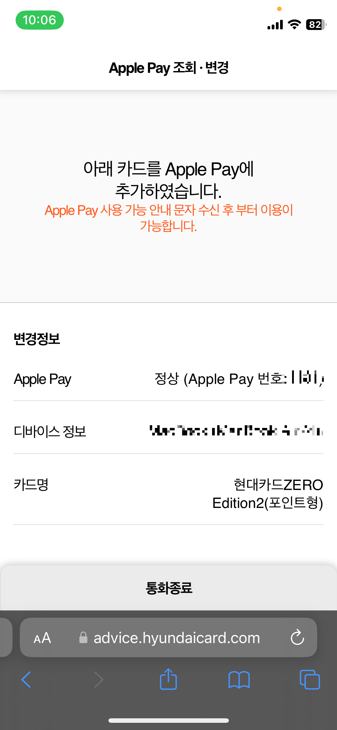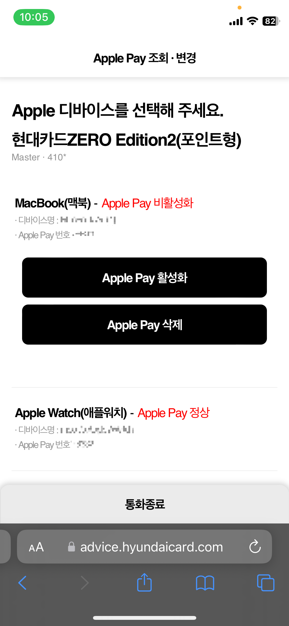 문자로 온 보이는 ARS링크를 누르면 왼쪽 사진처럼 현재 애플페이가 등록되어있는 기기들과 활성화 여부가 나온다.