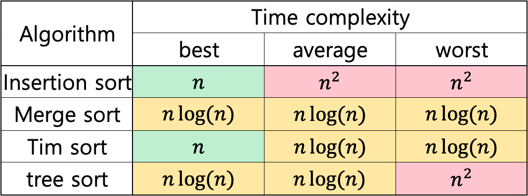 그 결과, 시간복잡도는 맨 아래의 도표와 같이 효율적으로 계산된다. 현재 java, python, rust등 다양한 프로그래밍 언어에서 기본 정렬 알고리즘으로 채택하여 사용하고 있다.